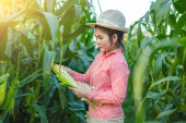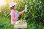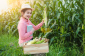 Rolnicy trzymają skrzynie pełne organicznej kukurydzy. Tło to pole kukurydzy..