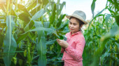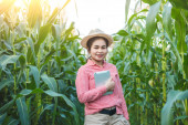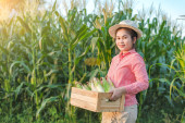 Zdjęcie "Rolnicy trzymają skrzynie pełne organicznej kukurydzy. Tło to pole kukurydzy.." może być wykorzystywane do celów osobistych i komercyjnych zgodnie z warunkami zakupionej licencji Royalty-free. Obraz jest dostępny do pobrania w jakości wysokiej rozdzielczości do 5760x3840.