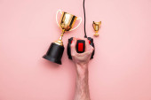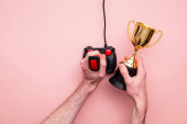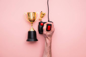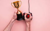 zwycięski gracz. Ręka za pomocą joysticka gry retro ze złotym trofeum