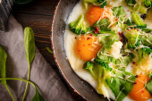 Zdjęcie "4 jajka smażone z serem? brokuły, szpinak, przyprawy na patelni na ciemnym drewnianym tle, Śniadanie, widok z góry, zbliżenie" może być wykorzystywane do celów osobistych i komercyjnych zgodnie z warunkami zakupionej licencji Royalty-free. Obraz jest dostępny do pobrania w jakości wysokiej rozdzielczości do 5760x3840.