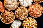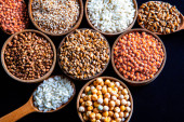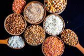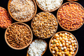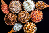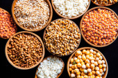 Zdjęcie "Miski różnych zbóż. Różne rodzaje naturalnych ziaren i zbóż. Różne rodzaje kaszy w miskach na czarnym tle. Zdrowe odżywianie" może być wykorzystywane do celów osobistych i komercyjnych zgodnie z warunkami zakupionej licencji Royalty-free. Obraz jest dostępny do pobrania w jakości wysokiej rozdzielczości do 5760x3840.