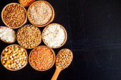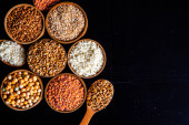 Zdjęcie "Miski różnych zbóż. Różne rodzaje naturalnych ziaren i zbóż. Różne rodzaje kaszy w miskach na czarnym tle. Zdrowe odżywianie" może być wykorzystywane do celów osobistych i komercyjnych zgodnie z warunkami zakupionej licencji Royalty-free. Obraz jest dostępny do pobrania w jakości wysokiej rozdzielczości do 5760x3840.
