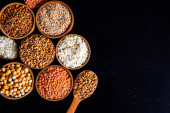 Miski różnych zbóż. Różne rodzaje naturalnych ziaren i zbóż. Różne rodzaje kaszy w miskach na czarnym tle. Zdrowe odżywianie