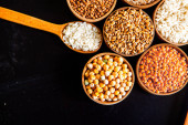 Zdjęcie "Miski różnych zbóż. Różne rodzaje naturalnych ziaren i zbóż. Różne rodzaje kaszy w miskach na czarnym tle. Zdrowe odżywianie" może być wykorzystywane do celów osobistych i komercyjnych zgodnie z warunkami zakupionej licencji Royalty-free. Obraz jest dostępny do pobrania w jakości wysokiej rozdzielczości do 5760x3840.