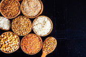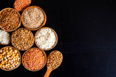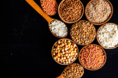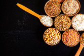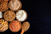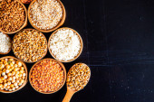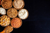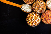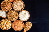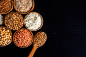 Zdjęcie "Miski różnych zbóż. Różne rodzaje naturalnych ziaren i zbóż. Różne rodzaje kaszy w miskach na czarnym tle. Zdrowe odżywianie" może być wykorzystywane do celów osobistych i komercyjnych zgodnie z warunkami zakupionej licencji Royalty-free. Obraz jest dostępny do pobrania w jakości wysokiej rozdzielczości do 5760x3840.