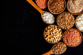 Miski różnych zbóż. Różne rodzaje naturalnych ziaren i zbóż. Różne rodzaje kaszy w miskach na czarnym tle. Zdrowe odżywianie