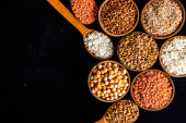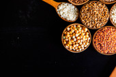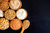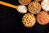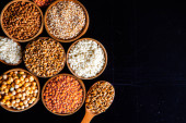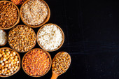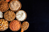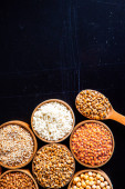 Zdjęcie "Miski różnych zbóż. Różne rodzaje naturalnych ziaren i zbóż. Różne rodzaje kaszy w miskach na czarnym tle. Zdrowe odżywianie" może być wykorzystywane do celów osobistych i komercyjnych zgodnie z warunkami zakupionej licencji Royalty-free. Obraz jest dostępny do pobrania w jakości wysokiej rozdzielczości do 5760x3840.