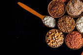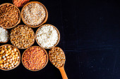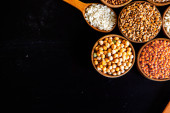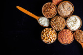 Zdjęcie "Miski różnych zbóż. Różne rodzaje naturalnych ziaren i zbóż. Różne rodzaje kaszy w miskach na czarnym tle. Zdrowe odżywianie" może być wykorzystywane do celów osobistych i komercyjnych zgodnie z warunkami zakupionej licencji Royalty-free. Obraz jest dostępny do pobrania w jakości wysokiej rozdzielczości do 5760x3840.
