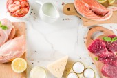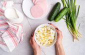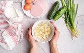 Krok po kroku przygotowanie zimnej zupy okroshka z kiełbasą, krok 1 - przygotowanie niezbędnych składników, widok z góry, ostrość selektywna