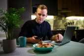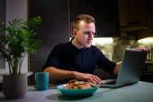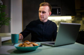 Zdjęcie "Portret uśmiechniętego młodzieńca pracującego na laptopie z domu i pijącego kawę z kubka i zadowolonego ze swojej pracy. Przytulne nowoczesne mieszkanie. Praca w domu, koncepcja biznesu online" może być wykorzystywane do celów osobistych i komercyjnych zgodnie z warunkami zakupionej licencji Royalty-free. Obraz jest dostępny do pobrania w jakości wysokiej rozdzielczości do 5760x3840.