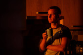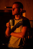 Portret uśmiechniętego młodzieńca pracującego na laptopie z domu i pijącego kawę z kubka i zadowolonego ze swojej pracy. Przytulne nowoczesne mieszkanie. Praca w domu, koncepcja biznesu online