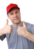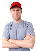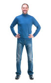 uśmiechnięty człowiek w szary t-shirt i jeanse na białym tle na biały backgro
