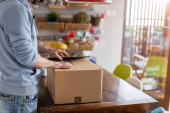 Młody człowiek rozpakowuje pudełka z jedzeniem w domu