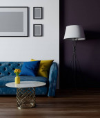 Nowoczesne, jasne, puste wnętrze. Renderowanie 3D. Żółta sofa na tle niebieskiej ściany, z kwiatami