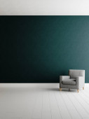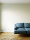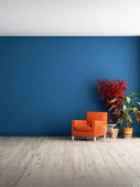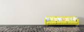 Nowoczesne, jasne, puste wnętrze. Renderowanie 3D. Żółta sofa na tle niebieskiej ściany, z kwiatami