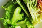Martwa natura świeżych, zielonych warzyw. Cukinia, młoda kapusta, sałata. Na szarym tle. Znajduje się po lewej stronie. Miejsce na tekst. Pionowe zdjęcie. Widok z góry.