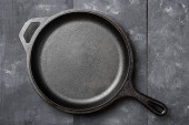 Patelnia na drewnianym tle stołu. Widok z góry. Zamknij się.