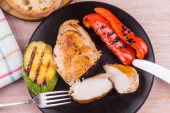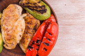 Filet z kurczaka z grillowanymi warzywami w talerzu na drewnianym stole - zbliżenie