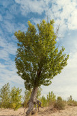 Piękne zielone drzewa i błękitne niebo w parku latem