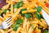 Makaron All 'Arrabbiata, tradycyjne włoskie danie - penne z sosem pomidorowym i bazylią na rustykalnym talerzu, zbliżenie, przestrzeń do kopiowania