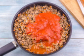 Smażona mielona wołowina i kliny ziemniaczane na patelni, zbliżenie - danie rustykalne