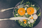 Świeża sałatka wegańska w czarnej płycie na drewnianym tle, przestrzeń do kopiowania - koncepcja zdrowej diety