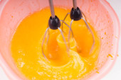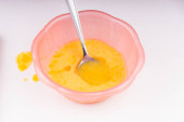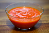szklaną filiżankę z pastą pomidorową na drewnianym tle - zbliżenie, widok z góry