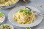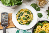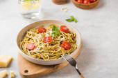 Pyszny makaron wegetariański z sosem szpinakowym na białym talerzu z pomidorami wiśniowymi