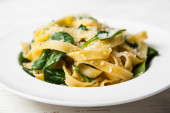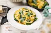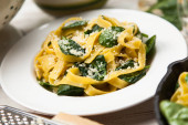 Pyszne danie wegetariańskie - makaron fettuccine ze szpinakiem i pomidorami wiśniowymi na rustykalnym stole
