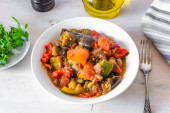 Tradycyjna zupa minestronowa z makaronem i siekaną zieloną pietruszką w talerzu na rustykalnym drewnianym stole zbliżenie z serwetką, słoneczny dzień - widok z góry, miejsce na kopię przepisu