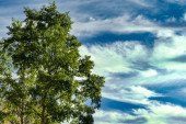 Wiosenne drzewa z młodymi liśćmi na tle błękitnego nieba, przestrzeń do kopiowania