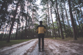 Młody turysta w luźnych ubraniach i plecaku spacerujący leśną drogą i rozglądający się z poważną twarzą. Stylowy facet spacerujący po górskiej drodze asfaltowej.