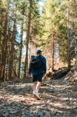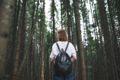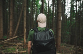 Tył młodego człowieka w luźnych ubraniach i z plecakiem spaceruje przez dziewiczy las iglasty i odwraca wzrok. Facet turysta spaceruje po lesie.