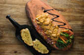 Smaczne frytki na desce do krojenia, na drewnianym tle stołu, Burger z serem i świeże frytki na drewnianym tle