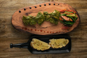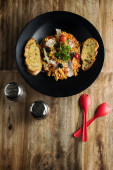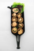 Spatchcocked kurczaka al mattone grill z warzywami jako widok z góry na starej planszy