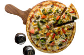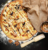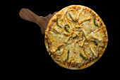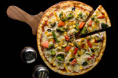 Zdjęcie "Pizza Pepperoni na drewnianej desce, Widok z góry pyszne i chrupiące wegetariańskie pizzy Margherita na jasnobrązowy stół tle" może być wykorzystywane do celów osobistych i komercyjnych zgodnie z warunkami zakupionej licencji Royalty-free. Obraz jest dostępny do pobrania w jakości wysokiej rozdzielczości do 5760x3840.