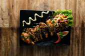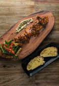 Spatchcocked kurczaka al mattone grill z warzywami jako widok z góry na starej planszy