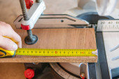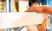 Mężczyzna ręka użyć środka taśma przygotować do montażu metalowego stojaka w magazynie lub przechowywaniu i półki do pudełek tekturowych produktów.