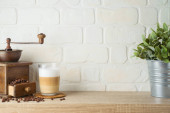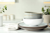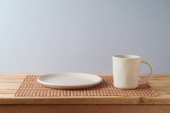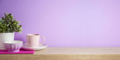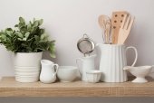Tło kuchenne z naczyniami, filiżanką, talerzem i rośliną na drewnianej półce