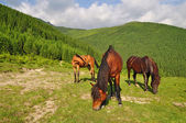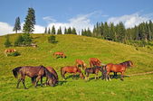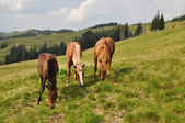 konie na wzgórzu przed deszczem odległe