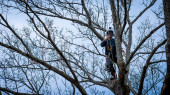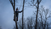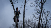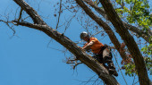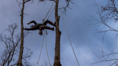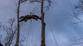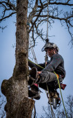 Pracownik z piłą łańcuchową i kaskiem zwisającym z liny i wycinającym drzewo