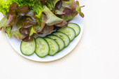 Martwa natura świeżych, zielonych warzyw. Cukinia, młoda kapusta, sałata. Na szarym tle. Znajduje się po lewej stronie. Miejsce na tekst. Pionowe zdjęcie. Widok z góry.