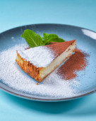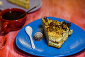 Kawałek tortu mrowiskowego z czekoladą na niebieskim talerzu nad wiejskim drewnianym stołem. Słodki pyszny deser.