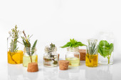 Butelki z różnymi olejkami eterycznymi na białym tle