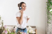 portret młodej pięknej kobiety zajmującej się roślinami domowymi, patrzącej na małe drzewo i rozmawiającej z nimi