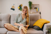 młoda piękna kobieta odpoczywająca i chłodząca się przy jasnym oknie, uśmiechnięta i odpoczywająca wygodnie
