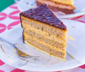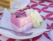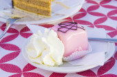 ciasta waniliowe i czekoladowe jednoskrętne pokryte polewą truskawkową z bitą śmietaną