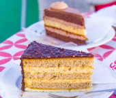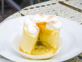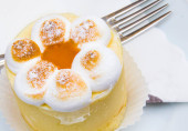 czekolada parfait, biszkopt, śmietana i mango z mleczną czekoladą jeż dekoracji