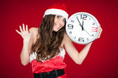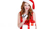 atrakcyjny dziewczynka w santa hat z prezentów na czerwonym tle