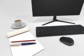 Szczegóły pulpitu z ekranem komputera, klawiatury, papieru i długopisów. Koncepcja biura. Renderowanie 3D.